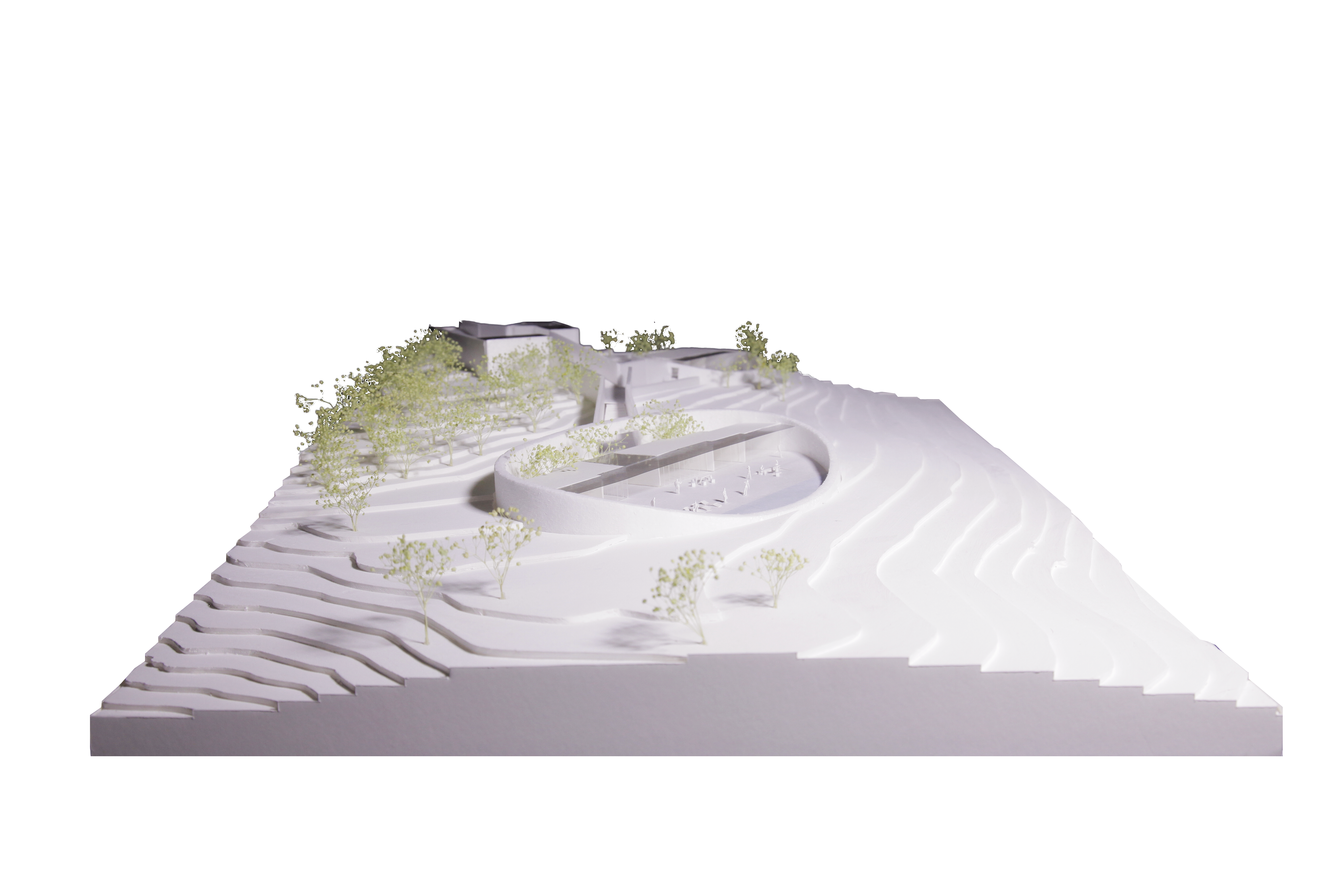 The outer limit is a long wall following an oval plan, whose height varies to reach the water of the pool and the ground of the site. The wall is not a boundary but rather a belt or a screen, subtly protecting from the surroundings to keep the privacy and keep from the wind.