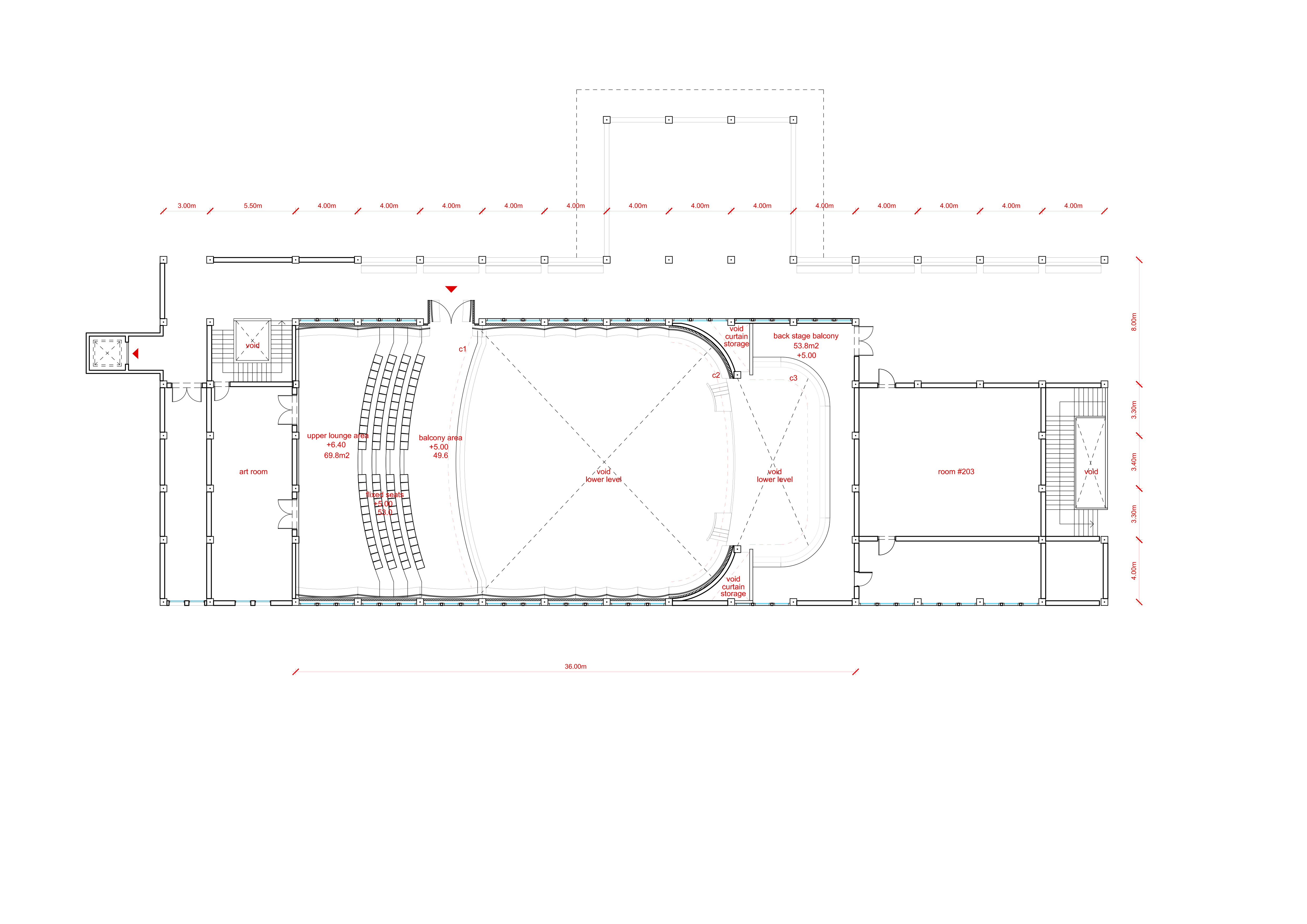 The proposed renovation provides a versatile approach to the auditorium spaces while providing an entry sequence for the audiences from the back entrance. Wall panels are designed with an arcrustic quality, thermal insulation, and incorporating mechanical services as one system to also provide a holistic architectural approach to the auditorium’s interior quality.
