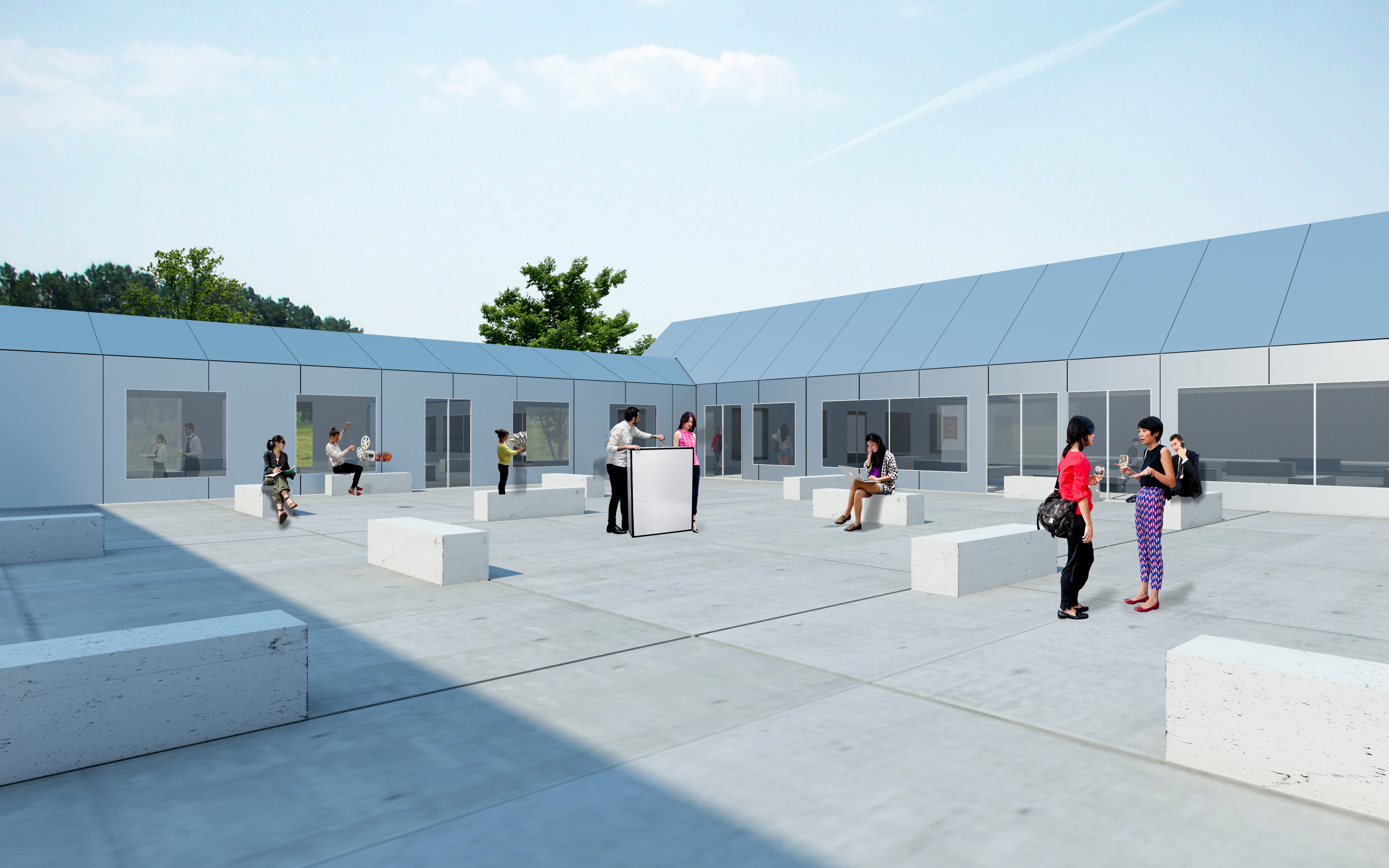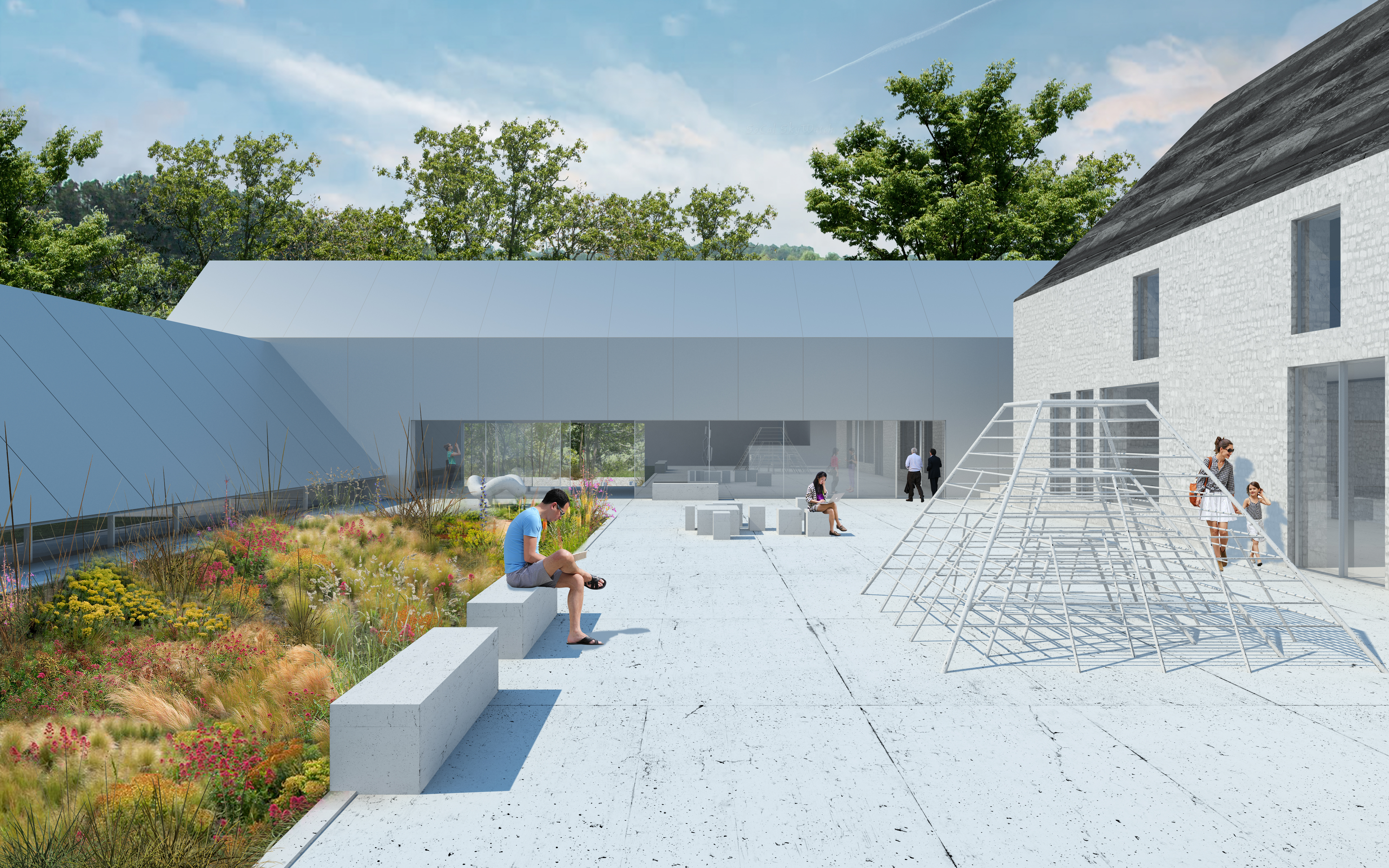 La rénovation de la Fabrique permet d’accueillir la majeure partie du programme culturel, avec pour acte majeur, la création d’un grand espace d’exposition qui débute au niveau R+1 et s’étend vers la Clairière. Cette galerie connecte deux temporalités: l’une à vocation historique dans le bâtiment ancien avec le Centre d’Interprétation et la seconde contemporaine, avec l’exposition d’oeuvre contemporaine. Les différents volumes permettent une flexibilité d’usage pour les expositions. Cette extension semi enterrée s’intègre dans la pente du terrain et se connecte au bâtiment La Prairie pour générer une nouvelle plateforme d’exposition extérieure. Les différentes ouvertures assurent des perspectives sur la cour comme sur l’environnement forestier.