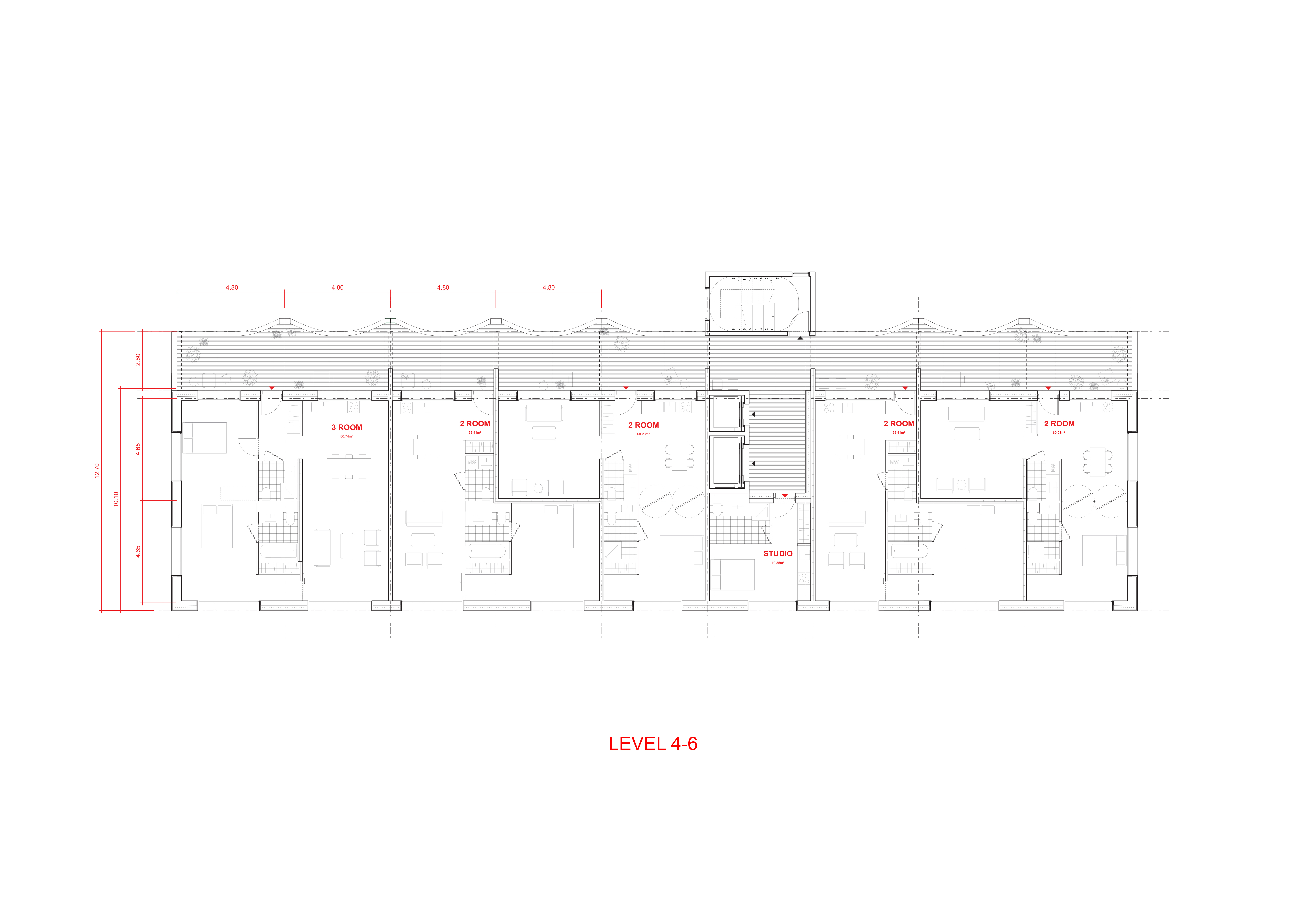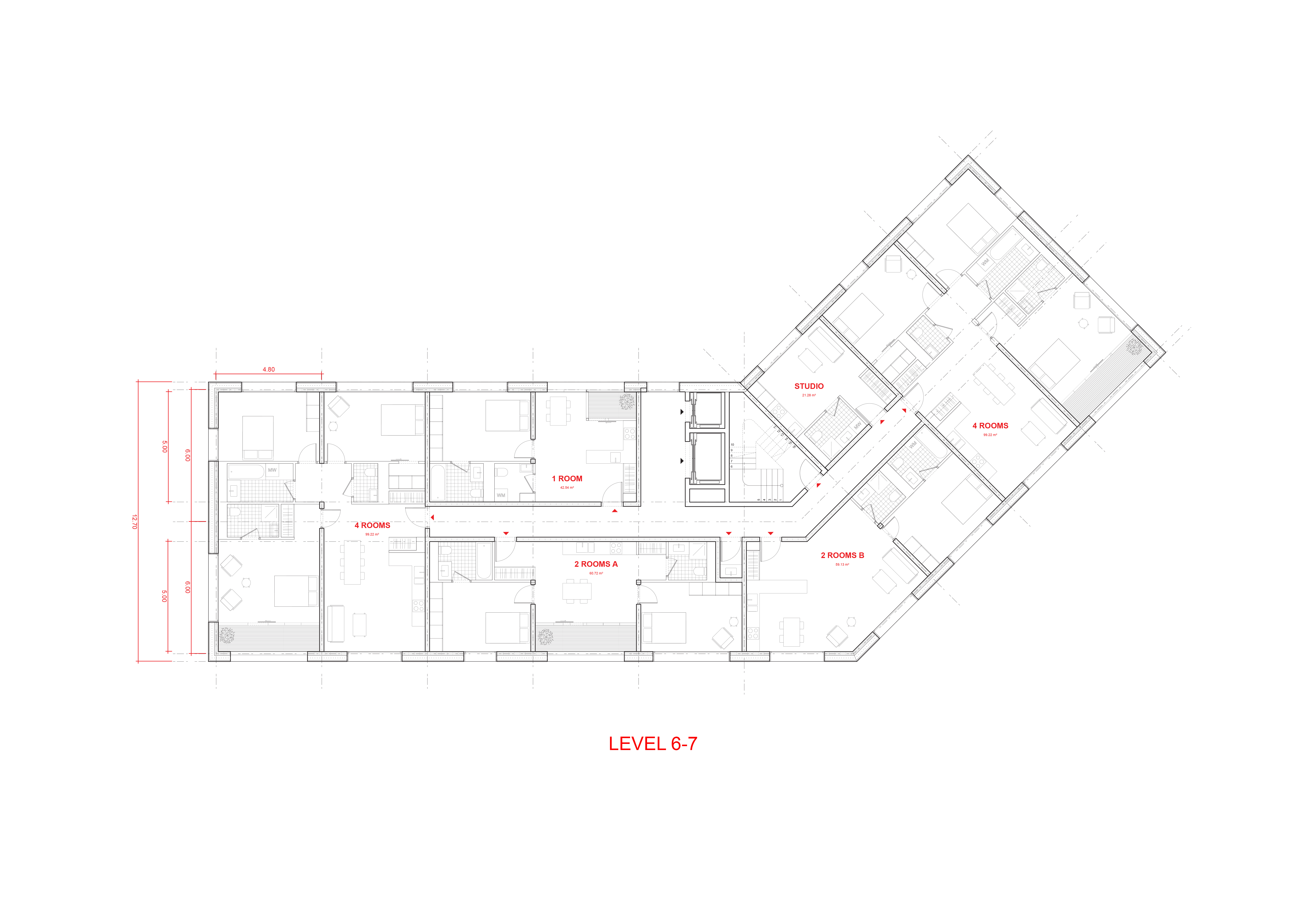With its 45° angle, the section with central access is the key element to the composition of our master plan. It allows for the irregularity within the urban block while bridging harmoniously with the urban context. At the same time, this angled configuration maximizes the sun exposure to each individual building.  The shaft systems are based on a 6m grid which allows for flexible and interchangeable reconfigurations of the apartment layouts while the facade can easily be subdivided by repetitive elements. The apartment units of the section with central access take shape in single and double oriented rooms, as well as multiple duplex for at its higher levels.